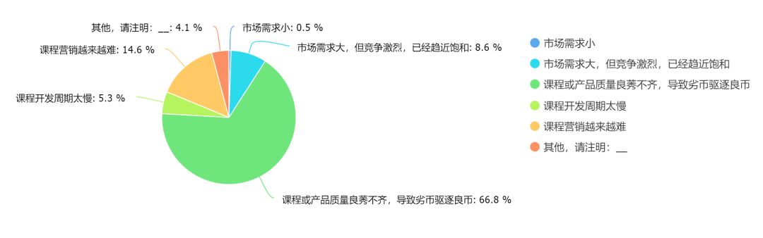 在从业者眼中,目前知识付费和在线教育领域最大的问题是课程或产品质量良莠不齐,导致劣币驱逐良币。这也反应出来目前行业内大家普遍的焦虑。
