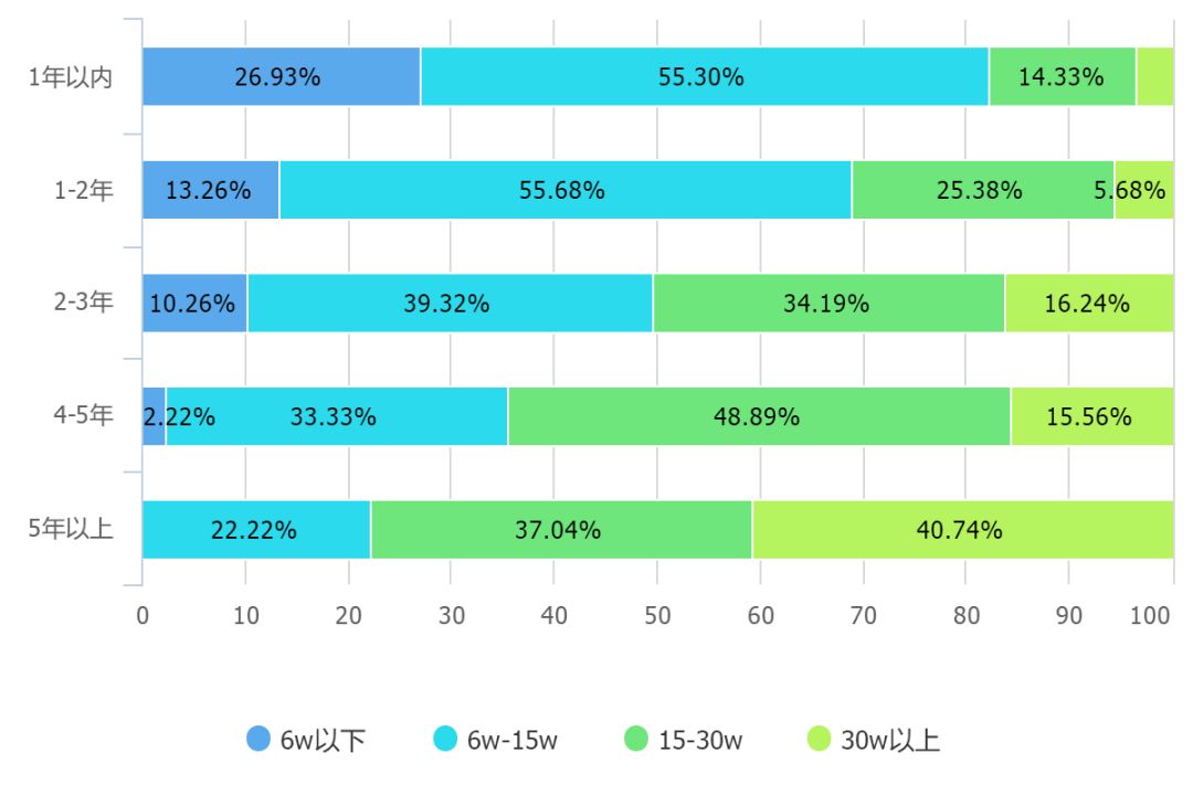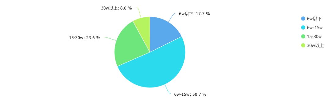 有50%的人薪资水平在6w-15w这个区间范围内。占比最多。