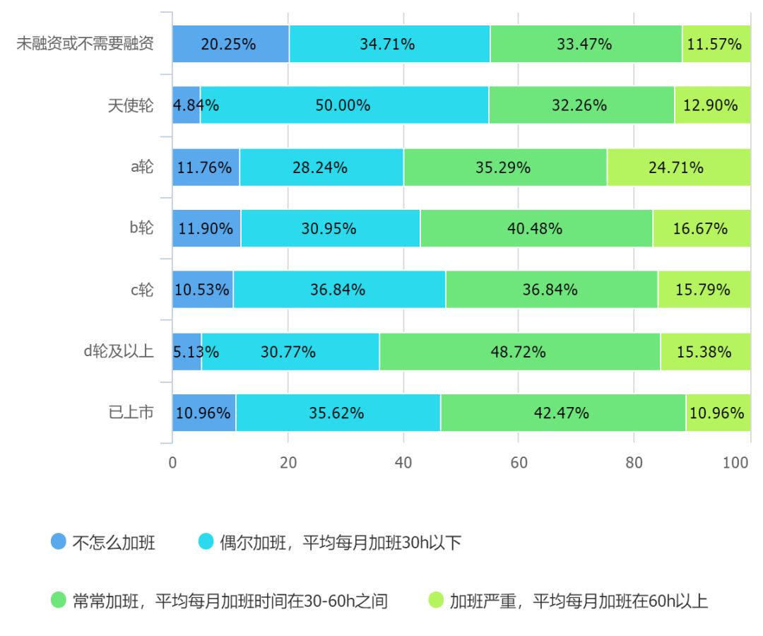 相对来说,处于上市前的企业和处于a轮的企业加班情况最多: