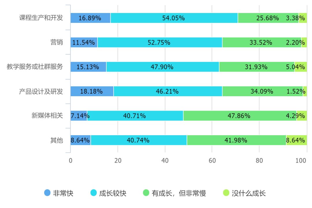 半数以上的从业者都认为自己在这个行业中经历着较快的成长,但是相比之下,新媒体从业者和其他职能支持类的从业者认为自己成长更慢,而课程生产和研发、产品研发和设计从业者则更多的认为自己经历快速成长。