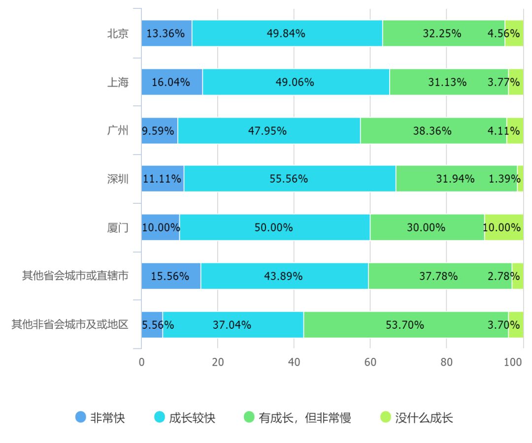 从地域上看,北京、上海、深圳三地的从业者认为自己的成长速度最快,相比之下,非省会城市或者地区的从业者则更多的认为自己的成长速度缓慢。