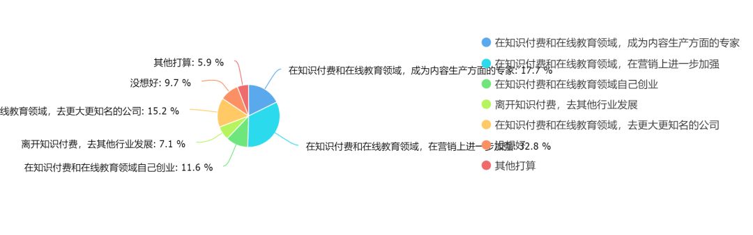 在思考未来的职业发展时,受访者中78%的人愿意留在知识付费领域,无论是在已有的岗位行做出更好的成绩、转去更大的公司,或是自己创业,这说明从业者对行业的忠诚度、认可度很高。