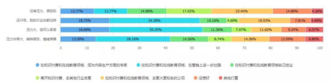 在有关职业未来发展上,有一项有趣的数据是,认为自己的工作很轻松,没有压力的人反而会更多的想离开知识付费行业或是尚未确定好方向;而认为工作有一定的压力,但压力在自己可以理解和承受的范围内时,反而会更多希望能在原有的岗位上继续提高相关的技能,哪怕是精神压力大到接近崩溃,也只有8%的人明确想要离开知识付费领域,到其他行业发展。