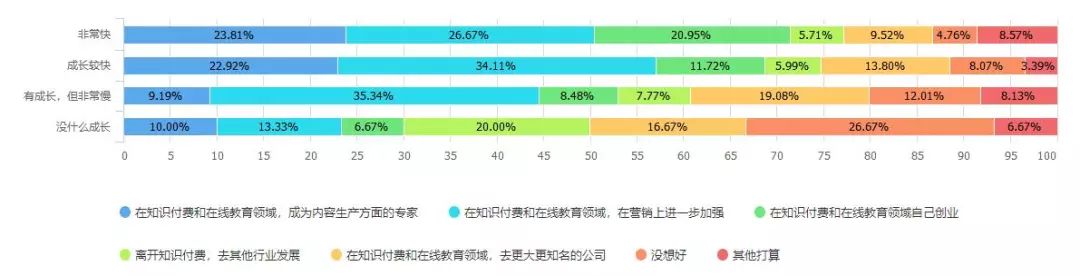 同时另一组数据显示,那些认为自己在现有的岗位上没什么成长的人,几乎丧失了职业技能成长和创业的意愿,更多的表现出迷茫的状态,也有更高的意愿离开知识付费行业。