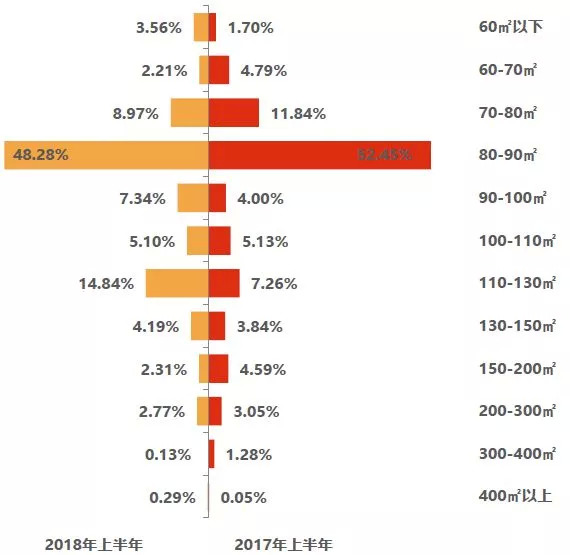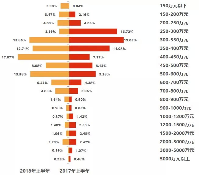 2018年上半年,从面积段来看,70-90 ㎡的刚需中小户型为深圳市场的成交主力,成交套数合计占比57.24%,与去年上半年相比减少了7.05个百分点。从价格段来看,总价600万元以下的住宅成交为深圳市场的成交主力,套数合计占比79.97%,与去年上半年相比减少了0.71个百分点。