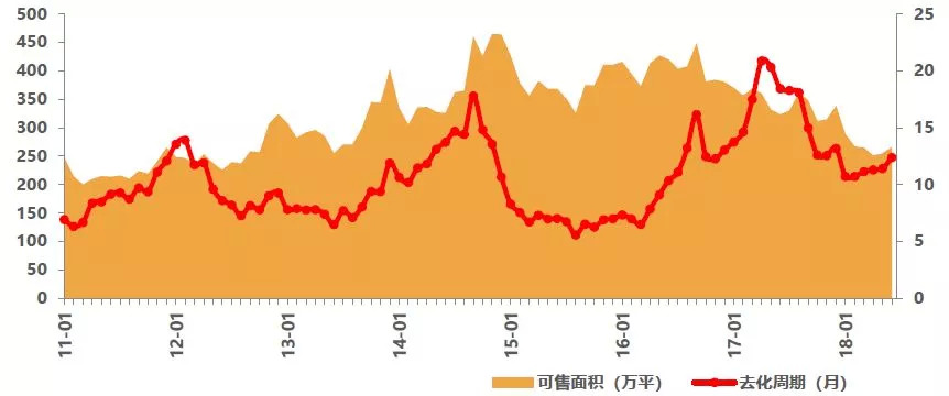 图:2011-2018年06月深圳市商品住宅库存面积及去化周期
