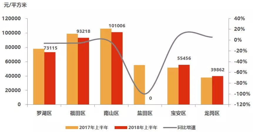 图:2017上半年和2018上半年深圳市商品住宅各区成交均价及涨跌幅