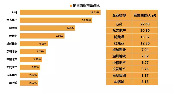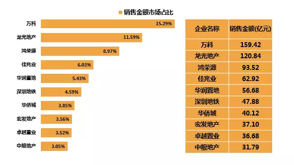 深圳房企的销售规模出现集中化趋势,强者恒强,万科凭借159.42亿元/22.63万m2雄踞深圳商品房销售额和销售面积排行榜双冠军;在商品住宅项目排行榜中,鸿荣源·壹城中心凭借65.28亿元/11.12万m2问鼎深圳商品住宅销售额和销售面积排行榜双冠军。