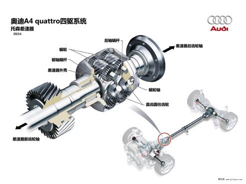 说起quattro四驱系统,本能的就会联想到托森差速器,其的强大之处在于利用蜗轮与蜗杆之间的纯机械自锁来实现差速与传动的功能,因此响应速度快,可靠性超高。但同时托森差速器也有短板:结构复杂,一定程度上影响了传动系统的效率;其次,不能实现100%锁止,前后扭矩分配能力相对有限。