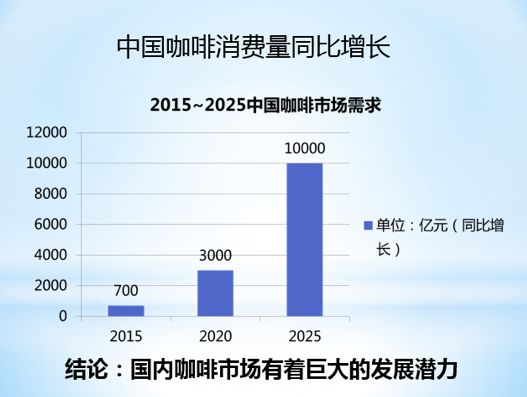 一是近年来我国的咖啡市场迎来前所未有的增速。根据伦敦国际咖啡组织统计显示,中国的咖啡市场增速全球第一,按照每年25%的增长,在一些一线城市甚至能达到30%左右,而全球的平均水平仅是 2%,有从业者预测,5年内国内咖啡可望达到万亿市场的容量。