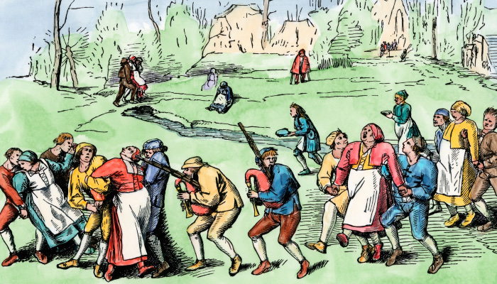 事情起于一小群人顶着夏日热浪出门跳舞。他们手舞足蹈,汗水浸湿衣衫,从当晚径直跳到了第二天。其间不曾进食或饮水,即便疲态尽显,腿脚也开始肿胀,过了好些天,他们还是那么跳着。后来政府开始干预,但又有数以百计的人加入到了这一狂舞热潮中。