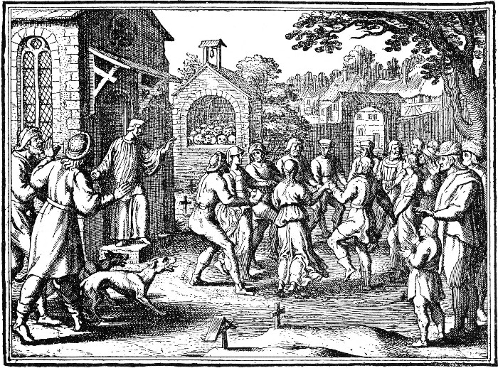 在之前许多个世纪里,莱茵河流域的城镇里还发生过好几次这样的突发性舞蹈活动,人数规模从几人到几百人不等。在饮用过莱茵河水的商人、朝圣者和士兵当中,流行着各种奇闻异事和都市传说。该地区的文化意识里有一项理念尤其深入人心:圣维特会用强迫跳舞的方式来惩罚罪人。位于斯特拉斯堡下游200英里处的科隆大教堂里有一幅画,以戏剧化的方式呈现了这一诅咒:在圣维特的形象之下,三个男人毫无乐趣地跳着舞,脸上挂着一副完全出离于现实的、迷乱的神情。