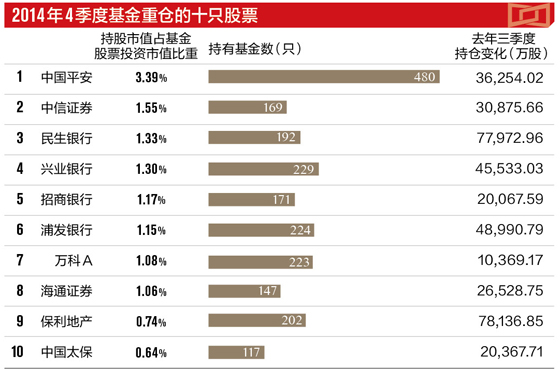 在刚刚公布的2014年基金四季度持仓情况中,1219只基金中有480只持仓了中国平安!甚至有机构100%满仓持有中国平安一只股票,如招商可转债!持仓市值排在基金第二位的中信证券,仅有169只。