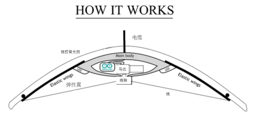 水母灯在人们看不见的静音马达的操控下,附着在弹性翼上的线被盘绕起来,从而推动灯翼的运动。