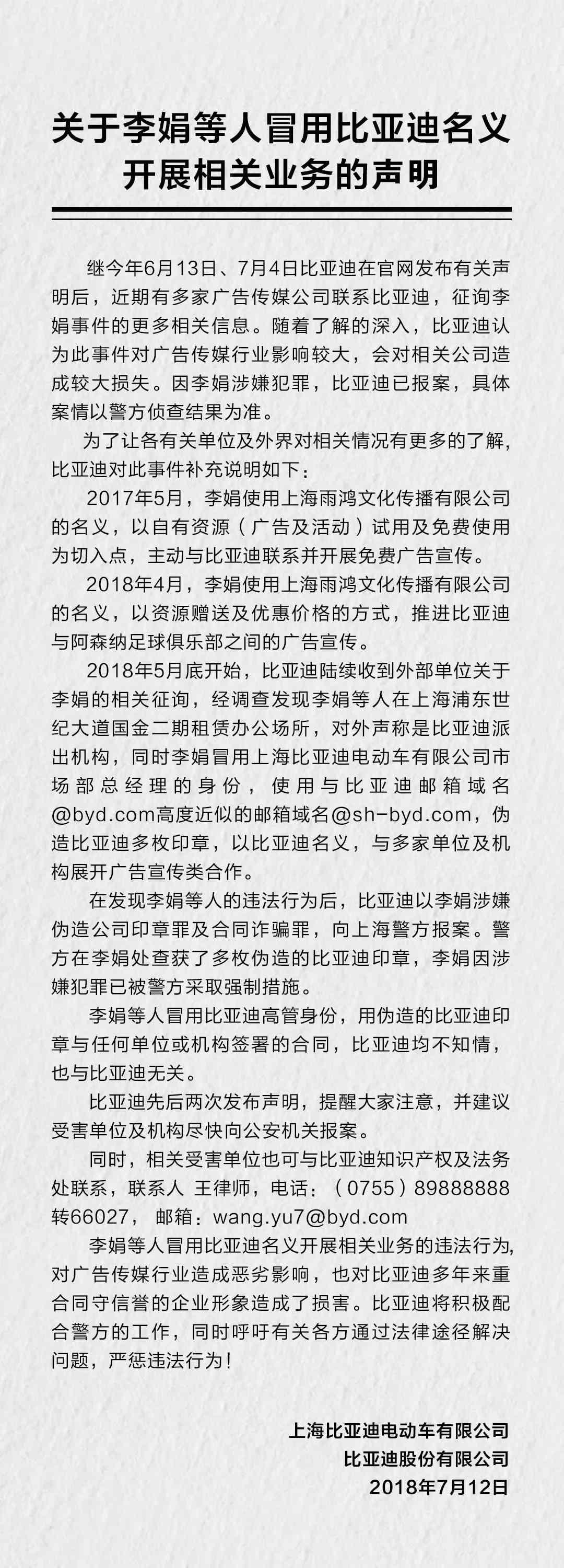 声明特别指出:“李娟曾使用上海雨鸿文化传播有限公司的名义,以资源赠送及优惠价格的方式,推进比亚迪与阿森纳足球倶乐部之间的广告宣传。”