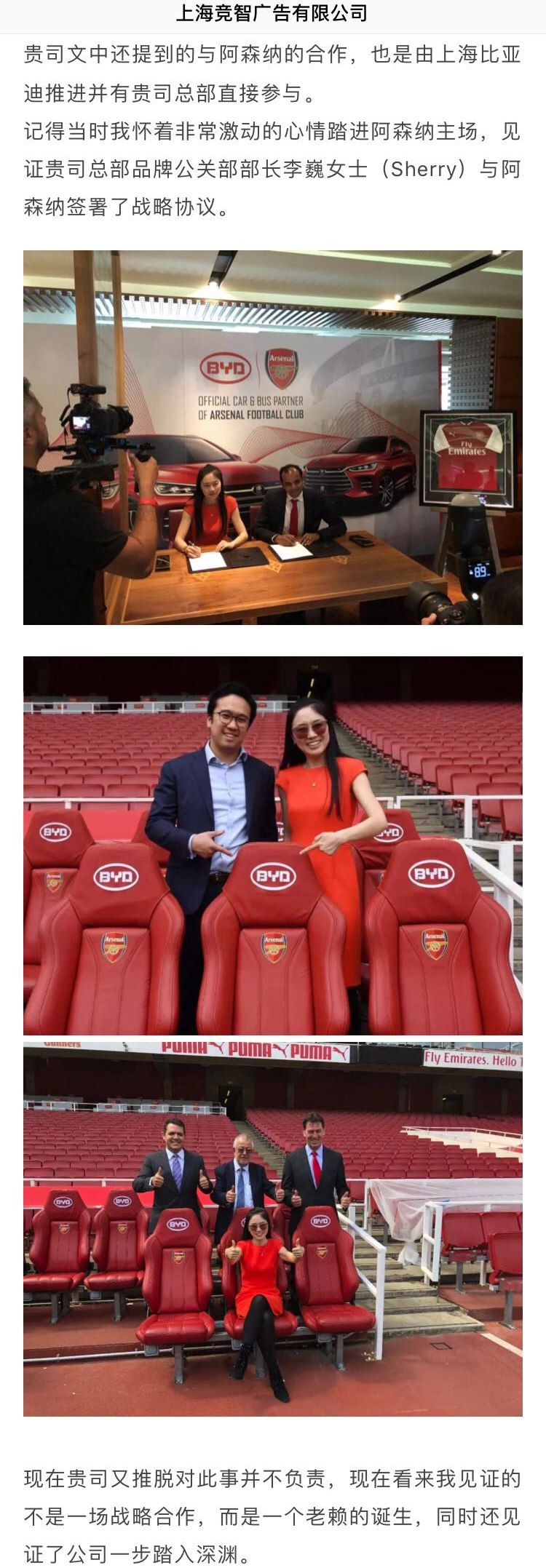 一家为比亚迪服务的广告公司则在比亚迪发布官方声明后公开表示,此举是比亚迪的“赖账”手段。该公司在声明中指出:“记得当时我怀着非常激动的心情踏进阿森纳主场,见证贵司总部品牌公关部部长李巍女士(Sherry)与阿森纳签署了战略协议。现在贵司又推脱对此事并不负责,现在看来我见证的不是一场战略合作,而是一个老赖的诞生,同时还见证了公司一步踏入深渊。”