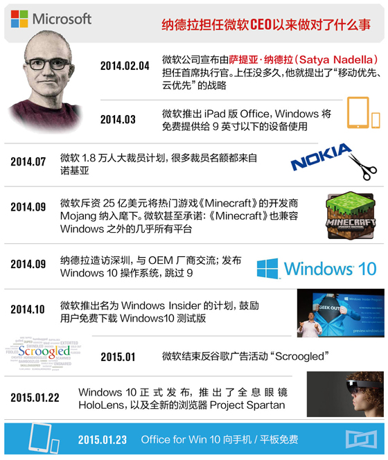 2014年的微软变得更加开放,不仅把Office移植到了移动端,而且还对9英寸以下的设备进行免费授权。近日又宣布针对部分用户,开放Windows 10的免费升级,这其中无不体现了纳德拉的想法。