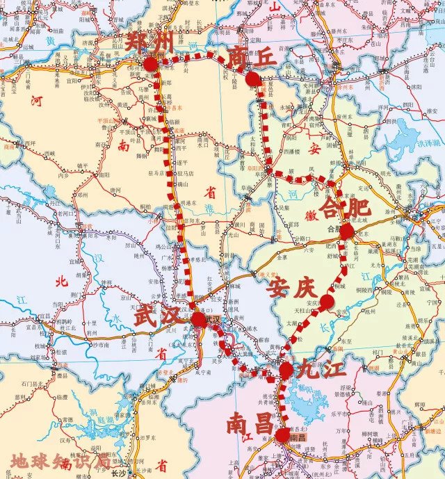 南昌向北,经昌九城际达到九江后,未来通过正在建设的合安九高铁可抵达合肥,进而通过正在建设的商合杭高铁到达商丘所在的中原地区。