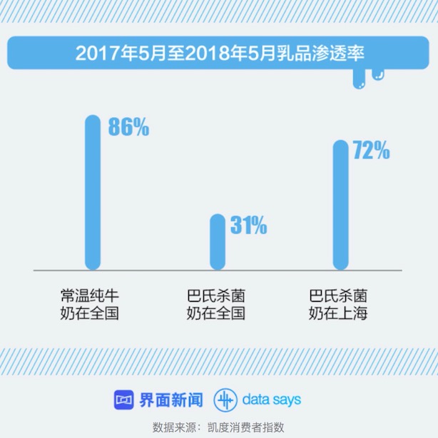 品牌咨询公司Prophet(铂慧)合伙人张承良告诉界面新闻,上海是巴氏奶的一个主要市场,巴氏奶的份额占总体牛奶销量的80%以上,普及率非常高,但另一面是提升空间有限,所以最近几年各个品牌主要是通过品牌或产品升级来提升溢价。