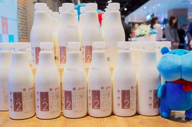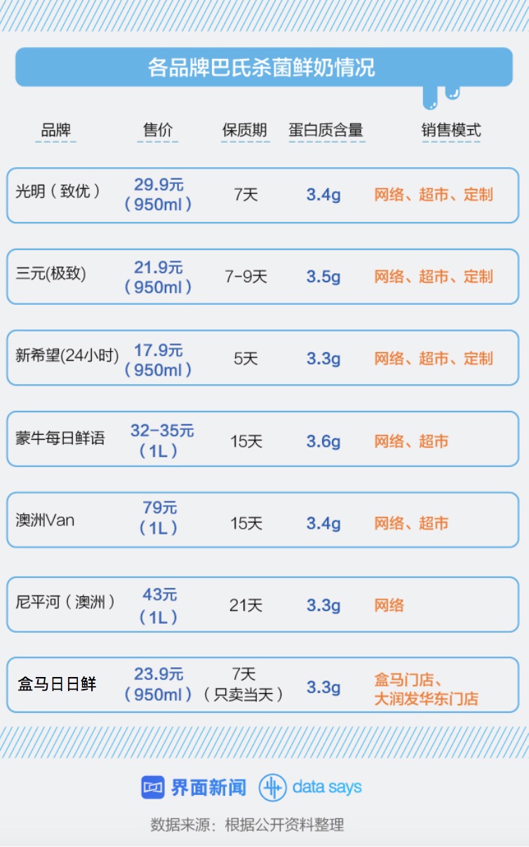 盒马鲜生不仅用了一整排货架来专门陈列鲜牛奶,还在去年联合了一些有经验的乳企在成都、上海等区域推出了“日日鲜”的鲜牛乳产品,和新希望的黄金24小时一样,这些产品都标榜只卖当天,每一个牛奶瓶子上都会打上当天的星期日期。