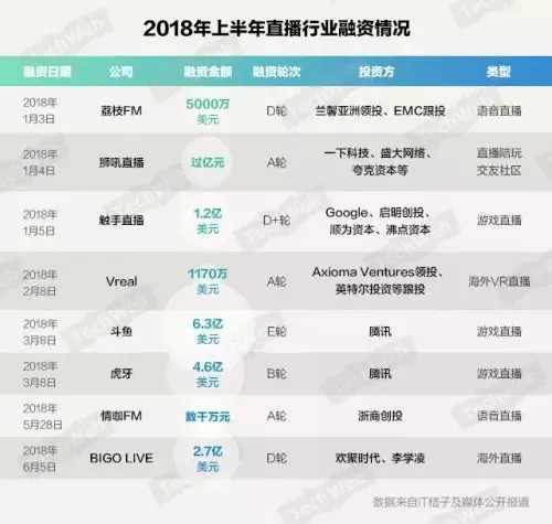 值得注意的是,在2018年上半年,直播行业的8起融资中,游戏直播和语音直播占到5起,成为更受资本青睐的类型。