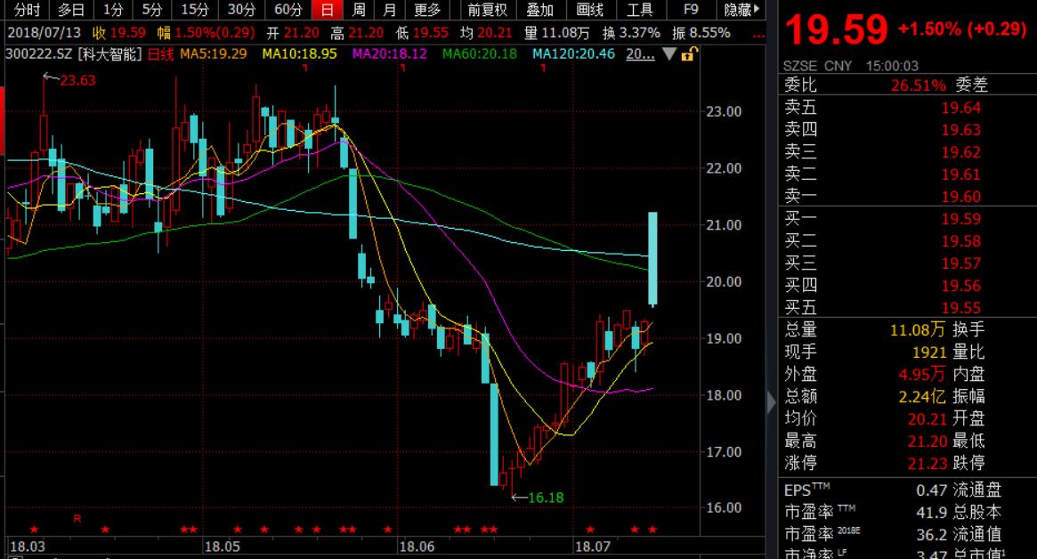 7月13日,科大智能(300222.SZ)公告称,实控人黄明松已与宿迁京东新盛企业管理有限公司(下称京东)签订股权转让协议,将其持有的科大智能5%股份转让给后者,作价6.18亿元,每股16.93元。受此利好消息,科大智能股价今日以逼近涨停价开盘,但投资者似乎并不看好,随后股价大幅回落,收于19.59元/股,涨1.5%。