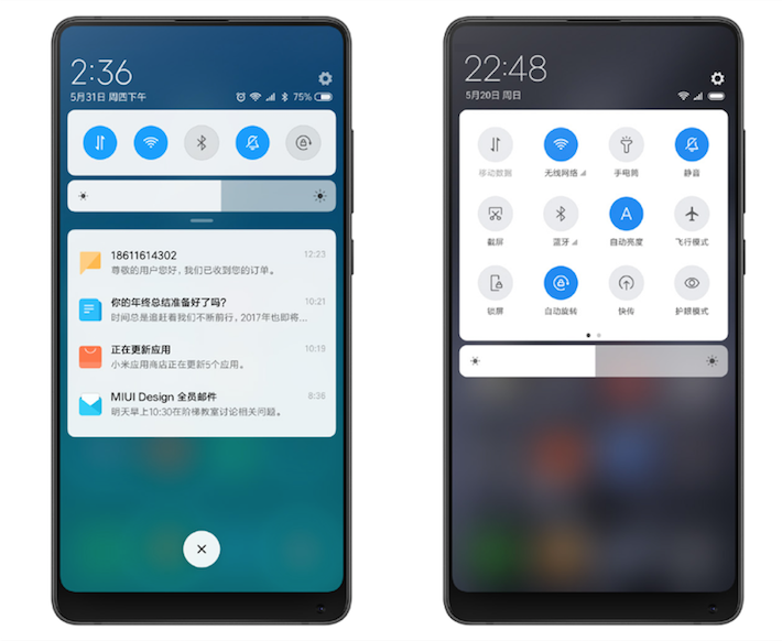 此外,亮度调节与音量调节面板也有改动。抛弃了以往拖拽小圆点的设计, MIUI 10 的亮度调节栏触摸区域得到了放大,在调节栏任意位置左右滑动都可以调整 亮度。
