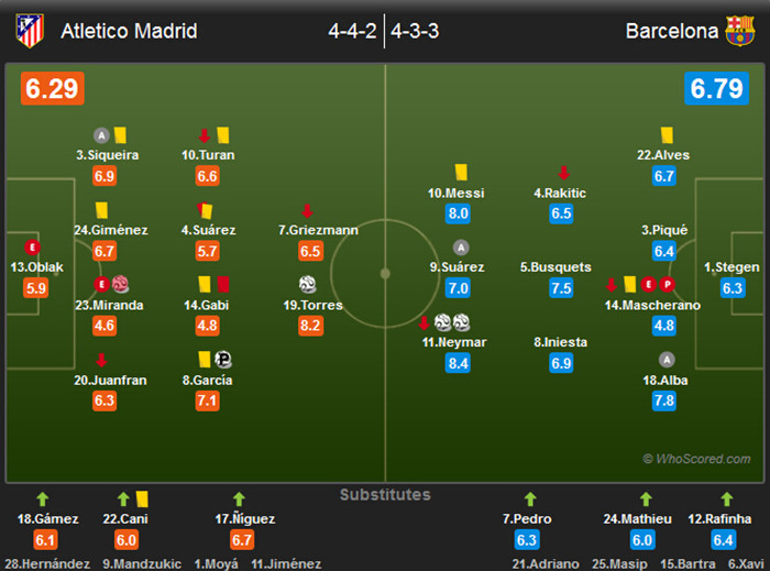 巴萨第41分钟完成对马竞的致命一击,格里兹曼10码处劲射打被禁区内的阿尔巴用手臂挡出,裁判未予判罚。梅西随即反击,他将球斜传左路从本方禁区狂奔至对方禁区的阿尔巴,后者远点钩回门前,内马尔轻松晃过奥布拉克后将球打入空门,总比分4-2。