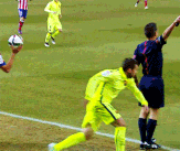 第17分钟,巴萨门将特尔施特根大脚发动反击,内马尔单刀破门因越位在先被判无效。不过从回放的慢镜头来看,门将开球的瞬间,马竞球员加比几乎同内马尔同在一条水平线,这一判罚也成为本场比赛裁判争议判罚的开始。