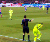 比赛中球员受伤的原因多种多样,而本场比赛中,阿尔巴还诠释了边裁的边旗也是需要防范的“暗器”之一。在一次回防中,身材矮小的边卫阿尔巴急于从边线外跑回球场,意图从手举边旗的边裁臂下穿过,哪知此时边裁正好使劲将边旗挥下,其头部不幸被边旗击中,痛苦倒地。