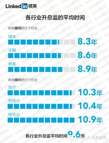 根据调查显示,从初入职场的愣头小伙儿到成长为运筹帷幄的总监平均需要花费9.6年。而媒体、金融和教育行业勇夺最快升总监级别前三甲,其中以微弱优势立于榜首的媒体从业者比最后一名建筑行业从业者走上人生巅峰的时间平均少了2.6年。这是因为在建筑、制造和医疗领域,很多高级职位对相关资格证书或从业年数有着硬性要求。所以如果你刚走出象牙塔,正在十字路口徘徊,一定要谨慎选择行业,不然你升职为总监的时间有可能会被拉长。