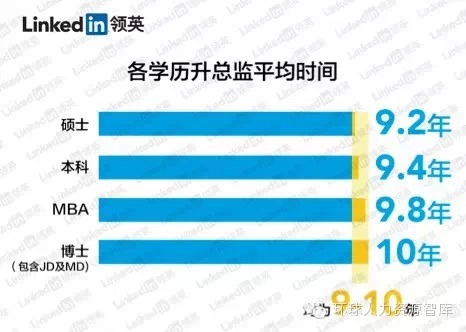 根据研究结果发现,硕士们升职最快,平均9.2年变总监,而最龟速升职桂冠由博士们扛起,平均为10年,比本科学历的小伙伴们还要多花费0.6年,让人不禁唏嘘6年青春许学术到底为哪般。