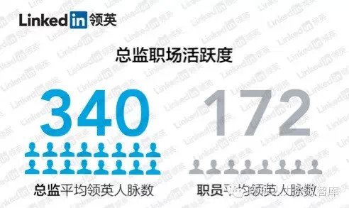 新人才讲人品,大神全凭人脉。相比普通职员,总监在领英平台上更显活跃。平均每位总监坐拥340位联系人搭建起自己的人脉圈,而普通职员只有172位联系人。总监的人脉数比普通职员几乎高出100%。