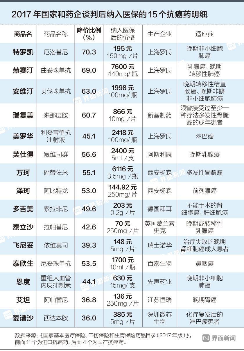 不只美罗华,2017年7月人社部共发布了15个抗癌药纳入医保(见下图),价格下降幅度明显,化疗药、靶向药的降价为重度癌症患者带来了很大实惠。治疗晚期非小细胞肺癌的靶向药特罗凯、治疗乳腺癌的靶向药赫赛汀,价格大幅度下降了70%。