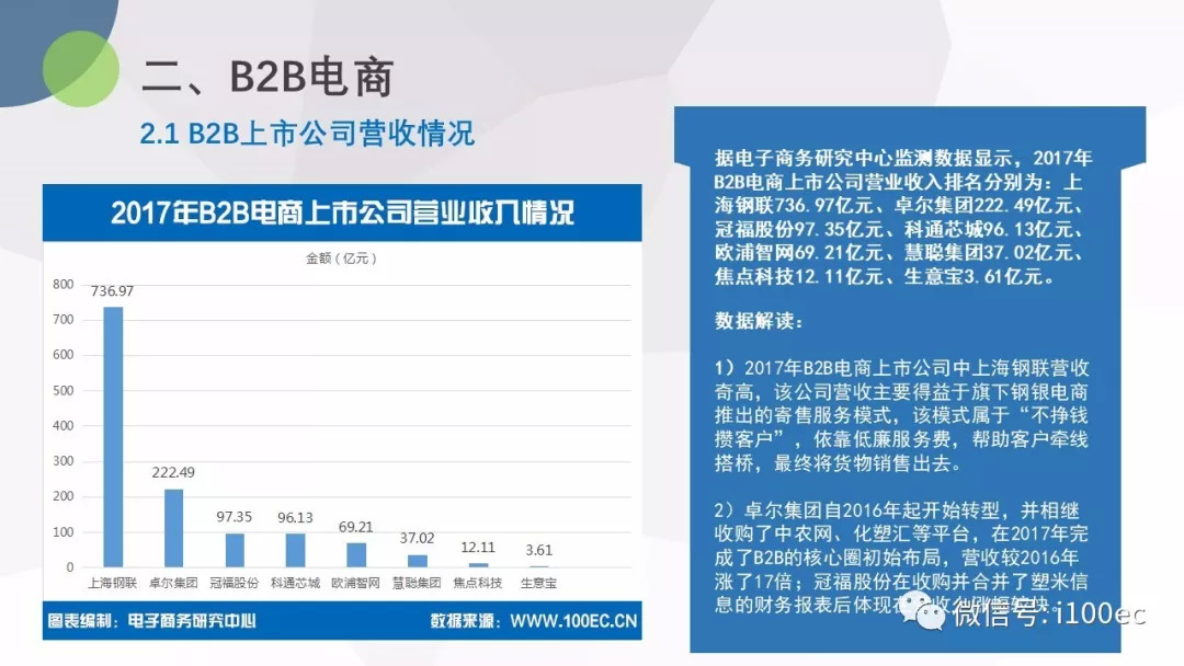 B2B上市公司营收情况:2017年B2B电商上市公司营业收入排名分别为:上海钢联736.97亿元、卓尔集团222.49亿元、冠福股份97.35亿元、科通芯城96.13亿元、欧浦智网69.21亿元、慧聪集团37.02亿元、焦点科技12.11亿元、生意宝3.61亿元。