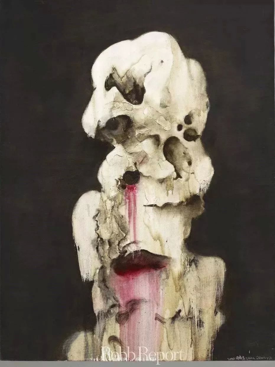 作品 《石头系列—雅安上里》中,石头的色彩鲜红浓烈,左上角晕染开的一片墨绿与之相衬,让整个画面透出一股潮湿味道。雅安有著名的“三雅”:雅鱼、雅雨、雅女。雨季的上里古镇是感受“雅雨”的大好时机,湿润空气中,薄雾萦绕于吊脚楼间,那被水浸透的石头透出的古朴的红,一切都湿漉漉的。周春芽一定是被这景象打动过,才有了作品中那充满生命力的红石。山石是周春芽从德国留学归来后迷上的第一个题材。这大概与他那时深入研究中国文人画不无关系。石头不移不朽,却变化万千,历经不同朝代画家们的观察,并在他们笔下反复呈现。周春芽创作山石之时,并未像国画家那样在材质属性和图式形态上去理解,而是按照自己的表现意图去寻找“陌生”和“惊喜”,他集中探索色彩、肌理、质感和造型,“近似于强迫症似的去捕捉和玩味那些潜藏在石头自然属性中的视觉因素”,把它们强化、放大,同时强调写意、表达个性,既契合了西方表现主义又兼具中国写意精神。此次港岛集粹收藏展中的《太湖石》非常引人注目,灰白色的石头于肃穆黑色背景前静立着,肌理凹凸不平,每个镂空凹洞表面和细节被精心打磨过,流动的红色如血液般从深色孔窍中溢出,静默的石头忽然有了个性和生气。“其实我从来没想过画血,后来看石头里面有泥巴,调色时红色调多了一点儿,画上去像血流下来的那种感觉。后来学生提出我的太湖石系列中有血腥、暴力的感觉。也许这就是太湖石的魅力和它那矛盾的状态与气质。”