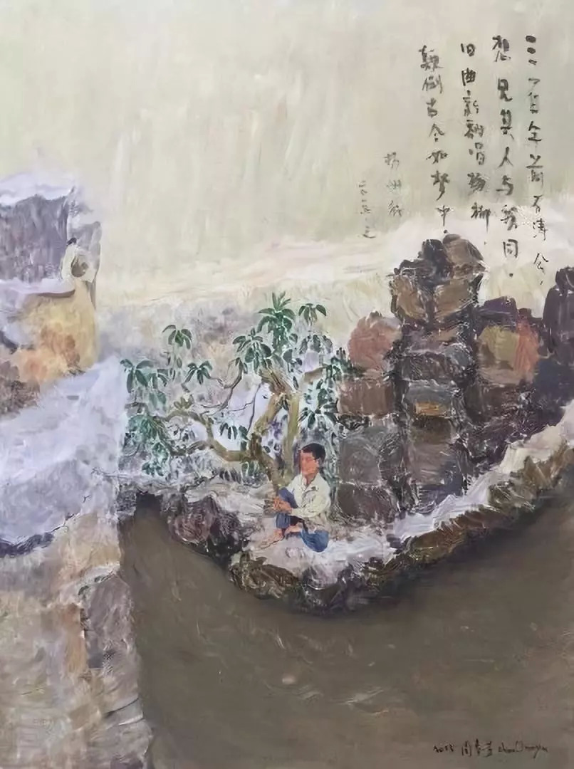 话语间,仿佛窥见源源不断的创作激情正从艺术家心底喷发出来,在他温和平静的外表下,酝酿着下一次的惊艳。卡夫卡说,艺术家的创作过程就是艺术家 “从内向外”表现自我意识的过程,我想起了周春芽2015年的一幅作品《仿石涛》,黄褐为主的色调,山石堆叠,形状各异,一棵小树摇曳着旺盛的绿意,树旁悠闲地坐着一人,周春芽说这是把石涛画中坐着的人画成了他自己。画中的周春芽似在远眺,又似在思考,抑或只是在放空,他面前是一汪汩汩流动的泉水,深浅未知。这画,如同周春芽其他作品,也如周春芽其人一般,静水流深。