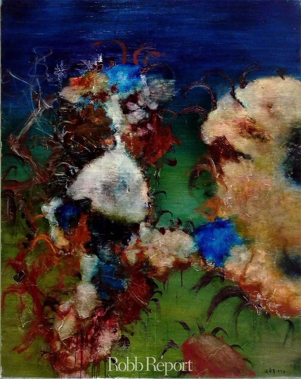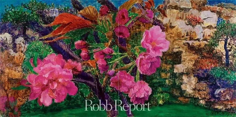 比如最为大众所熟知的桃花系列作品,流淌在画布之上满目深深浅浅的桃粉色,绚丽浓烈,不若“桃花带雨浓”那般娇羞,而是以令人血脉贲张的妖冶“占断春光”。还有同样在艺术家生涯中具有标志性意义的绿狗系列,尽管采用了象征宁静、浪漫与抒情的绿色,却以狗之龇牙咧嘴的狞厉状态释放出动物原始的野性欲望气息。就连那千古沉默的石头到了他笔下,也从凹凸有致的轮廓中渗出几抹吊诡的猩红,仿佛一副沉睡隐忍多时的老灵魂发出暗哑低沉的嘶吼。