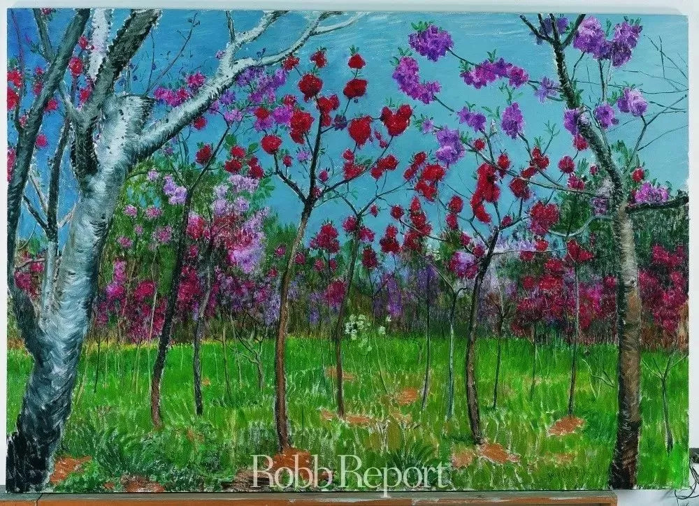 桃花之后园林成为了周春芽创作的又一主题,褪去艳丽妖娆的红,取而代之以大面积的紫,画面变得更为平稳,透出游山玩水之安逸。大众自然地将画中韵致与艺术家的生活联系起来,周春芽自己也应和道:“人老了,现在家庭也比较平稳,两个儿子这么小……”而当你以为看懂了他园林系列作品中所追求的平静安稳,他却忽然话锋一转:“但是说不清楚,我还有几十年要活,说不定园林里面暗藏杀机。”他身子微微前倾,眼睛里透出几分孩童般的兴奋与狡黠:“就像上海的豫园,里面很丰富、很复杂的,暗藏各种阴谋阳谋,以前小刀会的总部就在这个园林里面,经济交往、政治斗争、艺术品交易都曾在这儿发生。所以不要小看园林的平静,它里面是充满杀机的。”