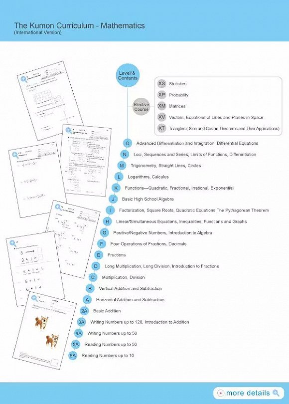 以Kumon有名的数学习题为例。根据Kumon提供的官方解释,目前Kumon的数学项目共包含多达4420份习题,从低到高分为6A(读10以下数字)到O(高级微分方程)共20个层级,另设立了5个选修课程,分别是统计学、概率论、矩阵、矢量与空间几何、三角形正余弦定理,满足不同学习和接受能力的学员在不同时期的需求。