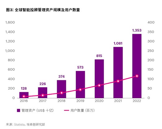 在国内,尽管发展较晚,但也呈现出快速发展态势,Statista估算国内智能投顾在2017年管理资产达到289亿美元,以惊人的速度发展,增长率高达261%,预计到2020年,智能投顾在国内将管理的资产将超过6600亿美元。