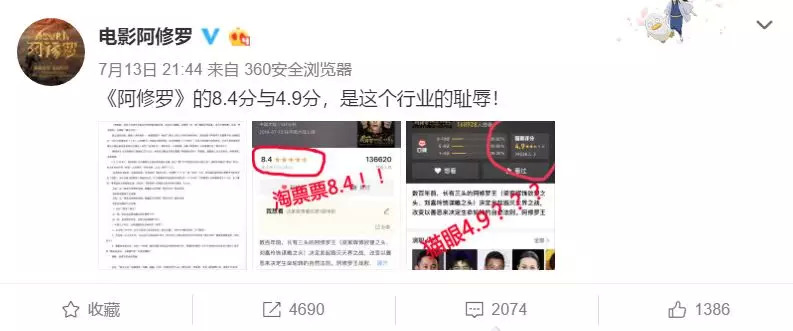 此前,片方曾质疑猫眼的4.9分为一场有组织、有预谋的“黑水行为”。但截至16日,《阿修罗》的豆瓣评分也相当不好看,只有3.1分。