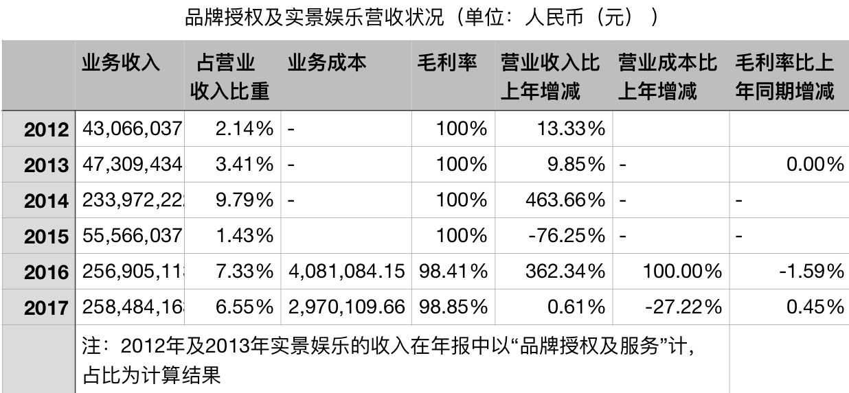 华谊兄弟从2012年起,年报上就有了品牌授权与实景娱乐板块的收入,2014、2016和2017财年这一板块营收均在2亿元以上。在诸多影视小镇、主题乐园尚未开业之时,华谊兄弟是通过与当地地产、文旅企业合作成立项目公司,并由项目公司向天津实景娱乐公司缴纳品牌授权费,而获得前期收入和利润的。