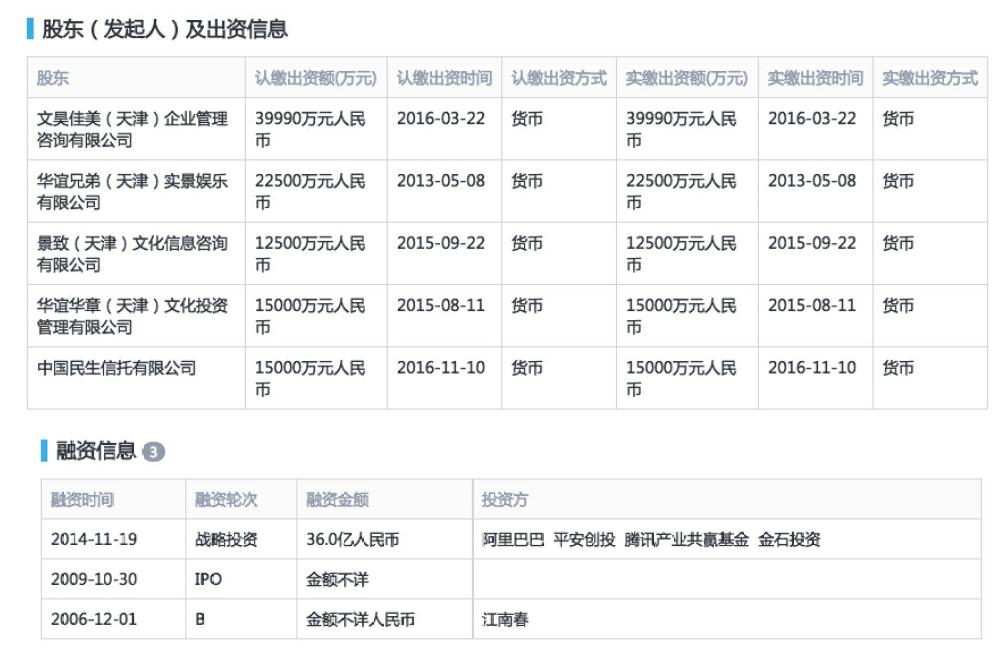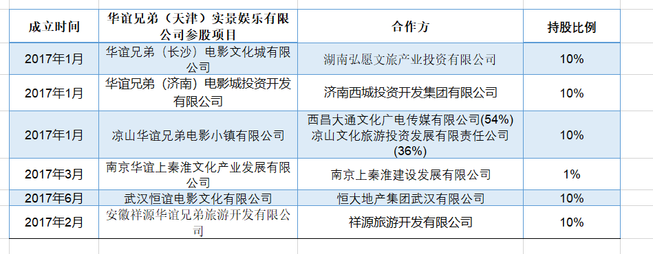 目前,华谊兄弟旗下的子公司以及联营企业中,涉及实景娱乐产业的有十余家,包括最早于2011年成立的华谊兄弟(天津)实景娱乐有限公司(下称天津实景娱乐公司)和华谊影城(苏州)有限公司(下称苏州华谊影城),以及2012年成立的海南观澜湖华谊冯小刚文化旅游实业有限公司(下称海南观澜湖旅游公司)。其中,天津实景娱乐公司是华谊兄弟集团内负责实景娱乐板块的主体公司,华谊兄弟持有其54%的股权。海南和苏州的两家公司,则是负责当地项目运营的项目公司。