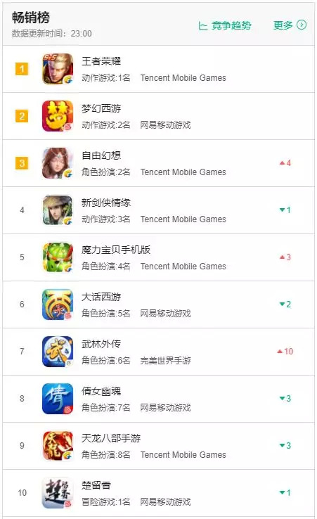 在7月4日的App Store游戏畅销榜上,Top10位置除了《王者荣耀》以外,其余9款皆为MMO产品。而更加值得注意的是,这里面包括4款年内新品。除了《楚留香》早在1月上线以外,其余的《自由幻想》、《魔力宝贝手机版》和《武林外传》均在近期上线。
