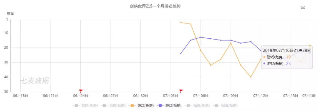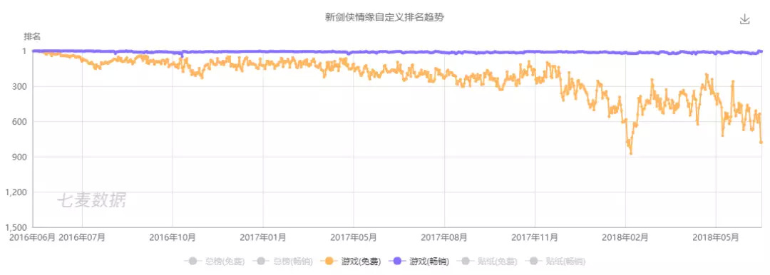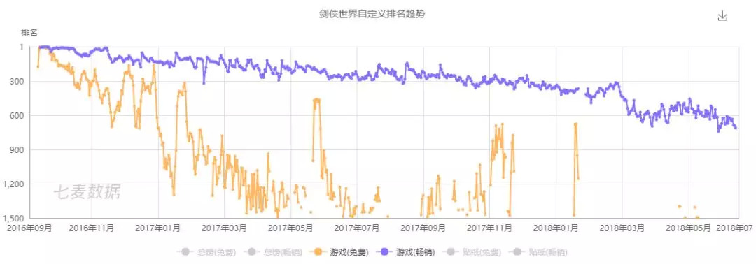 在Top100附近的拉锯战持续了约4个月。直到2017年3月28日,《剑侠世界》重返游戏畅销榜78名。从此排名便不断下滑,再无进入过Top100。