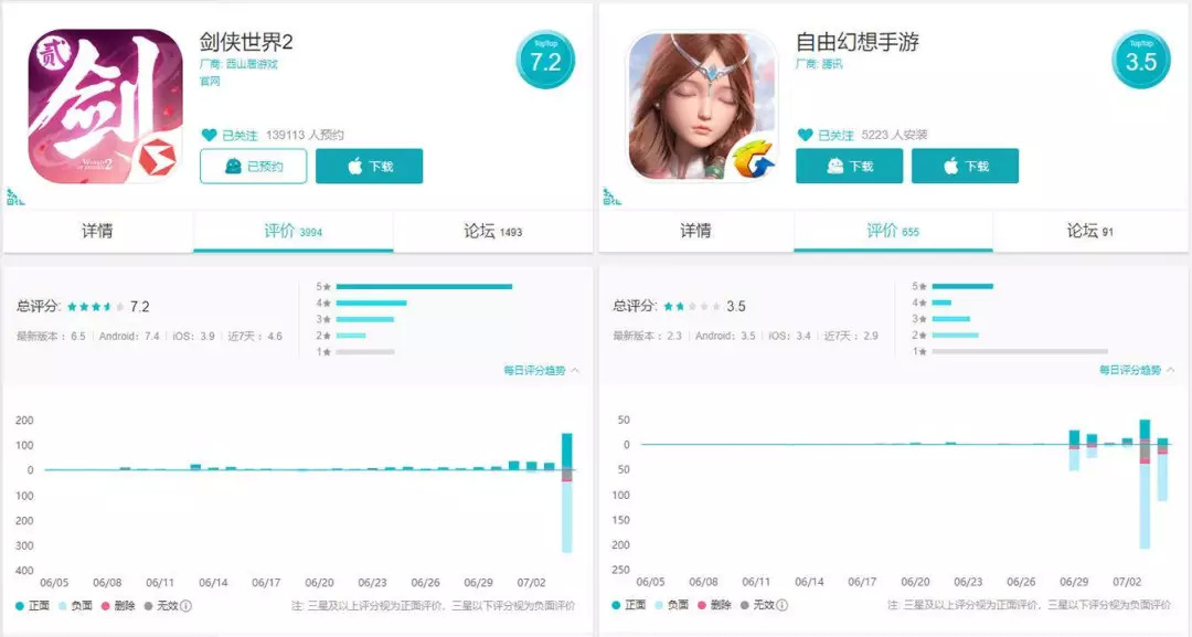 但两者在上线当天同样是获得负评居多,目前《剑侠世界》评分滑至6.3分