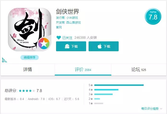 产品表现欠佳定有原因,其中最直观的离不开游戏质量。但从TapTap上玩家对《剑侠世界》的评价看来,这款产品除了在当时拥有较高热度之外,整体评价是相当不错。能够在超过2k评价里拿到7.8分,即使以目前的标准,也算是一款平均水平之上的MMO产品。