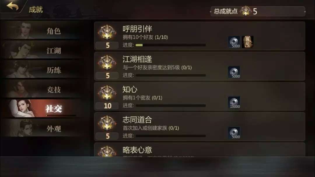 《剑侠世界2》的成就系统中,社交被单独列出。其中设定了包括好友数量、亲密度、家族等指标,达到即有奖赏,意在鼓励玩家参与社交。