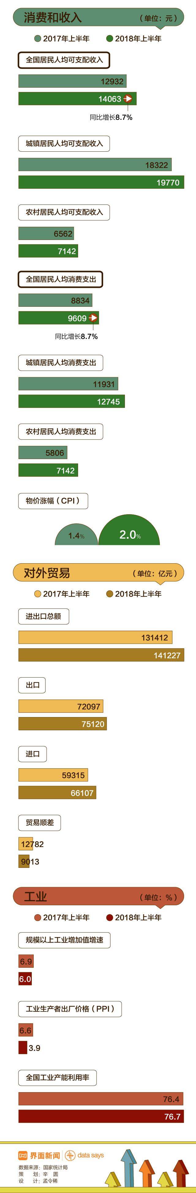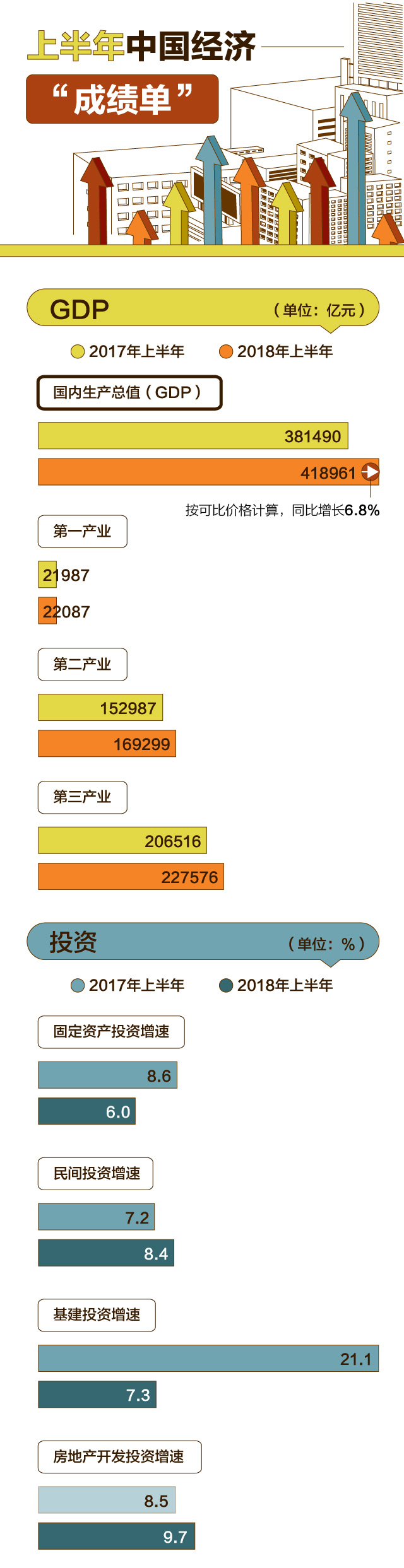 国家统计局16日发布数据,初步核算,上半年国内生产总值(GDP)418961亿元,按可比价格计算,同比增长6.8%。分季度看,一季度同比增长6.8%,二季度增长6.7%,连续12个季度保持在6.7%至6.9%的区间。